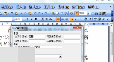 要编制索引,应该标记文档中的概念名词、短语和符号之类的索引项。索引的可以是书中的一处,也可以是书中相同内容的。标记了书中同一内容的所有索引项,可选择索引格式并编制,此后Word将收集索引项,字母顺序排序,引用页码,并会自动查找并删除同一页中的相同项,然后在文档中显示索引。以标记文中的“唯物主义”为例,先用鼠标选定文中“唯物主义”四字,然后“插入”菜单下的“索引和目录”,对话框后,选择“标记索引项”,下对话框后,选择“标记”最后“关闭”这时在原文中的“唯物主义”二字后面将会“{XE "唯物主义"}”的标志,按一下工具栏上的“显示/隐藏”按钮,可把标记隐藏或显示。你本书中所“唯物主义”的地方索引,可在个对话框后,“标记”,全书中凡“唯物主义”的页面都会被标记。索引的格式可自行选择,排序有“笔划”和“拼音”两种,默认项是“笔划”。