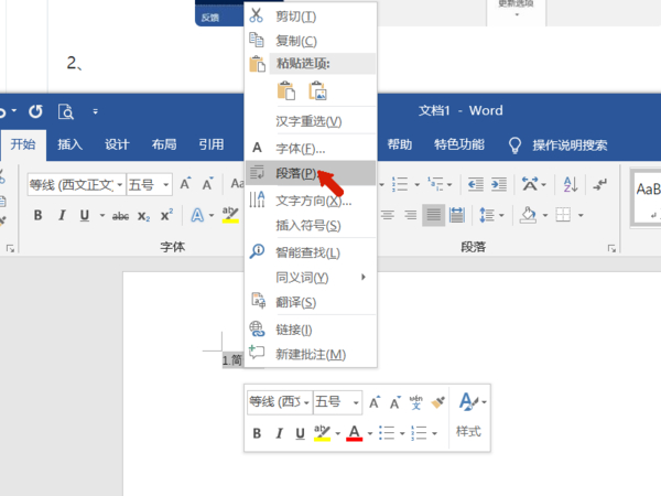2、首先打开office word办公文档,选择需要设置为主目录的文字,单击鼠标右键,选择段落菜单。