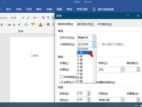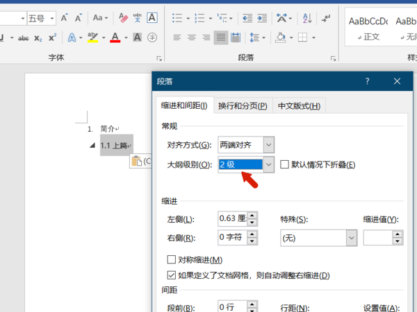3、在弹出的段落设置窗口中,将常规下的大纲级别修改为一级。