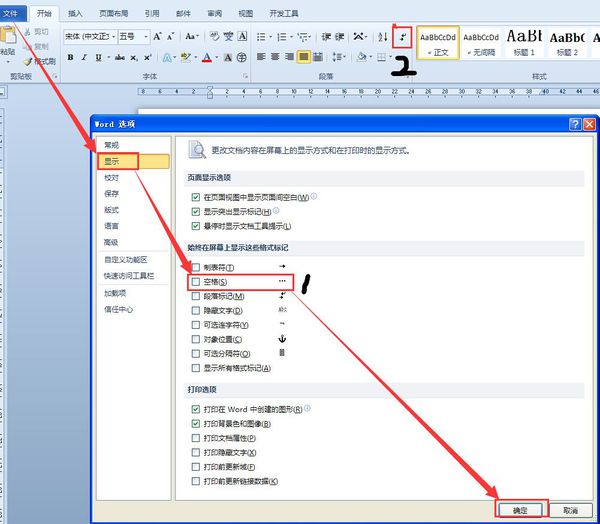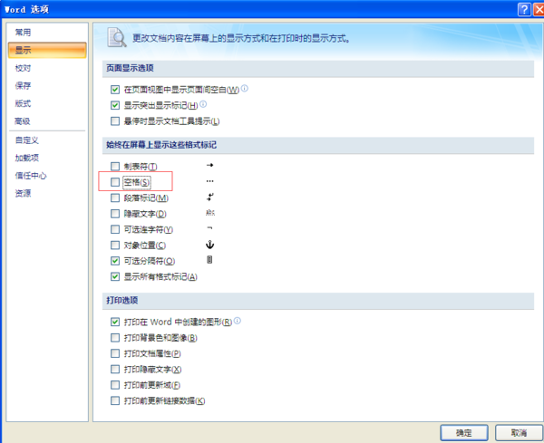 在打开的“Word选项”对话框中切换到“显示”选项卡,在“始终在屏幕中显示这些格式标记”区域选中“空格”复选框,并单击“确定”按钮,