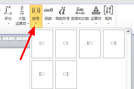 2、然后点击“矩阵”符号按钮,选择“大括号”样式,如图: