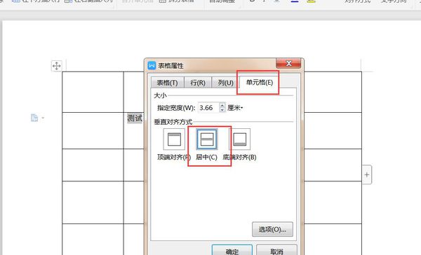 3、在打开的表格属性页面中,点击顶部“单元格”选项卡,点击垂直对齐方式为“居中”,并保存;