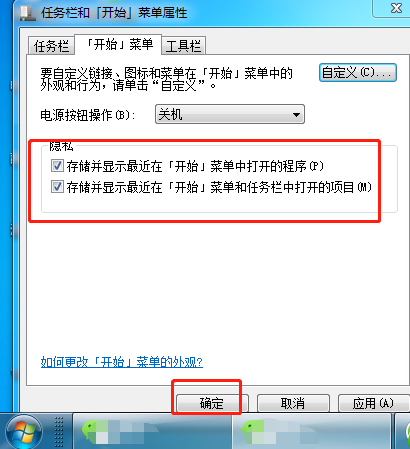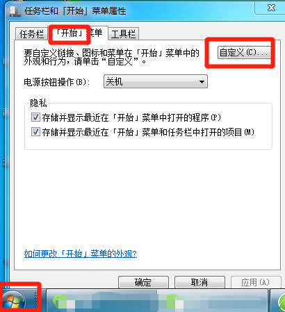 1、右键桌面左下角的的任务栏,选择“属性”,进去之后点击“开始菜单”,选择“自定义”。