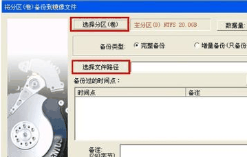 2、在弹出的“将分区(卷)备份到镜像文件”的窗口下点击“选择分区(卷)”和“选择文件路径”选择相应的“分区”和“文件路径”;