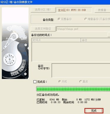 3、当选择完毕相应的“分区”和“文件路径”后,可以设定电脑在备份完成后关机或者重启电脑;将所有的设定都完毕以后,点击“开始”按钮即可。备份分区到镜像文件的过程需要一段时间,请耐心等待;当我们看到在备份分区的进度条完成,并且在下方出现“完成”的按钮时,则说明备份已经完成了,此时点击“完成”按钮即可。