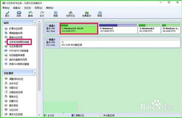 2、启动分区助手,在分区助手窗口,左键点击磁盘1的系统盘C,在窗口左侧点击:迁移系统到固态磁盘(机械硬盘也点击此项);