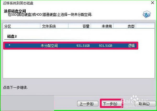 4、在选择磁盘空间窗口,左键点击磁盘2 的未分配空间,再点击:下一步;