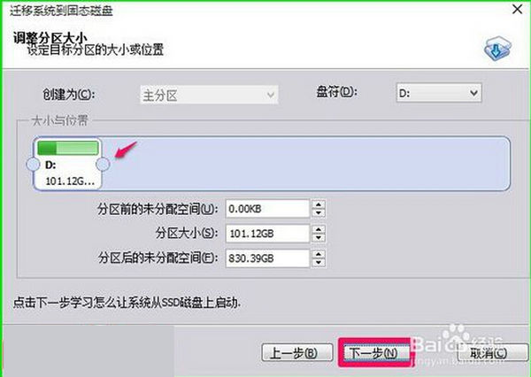 5、在调整分区大小窗口,我们默认创建为主分区,符号为D(以后可以更改盘符),用鼠标按住箭头所指的小圆点向左拖动调整分区为101G(如以后安装双系统,软件程序都会安装到系统盘所以安排101G,如果不准备安装双系统,可以只安排50G左右),再点击:下一步;