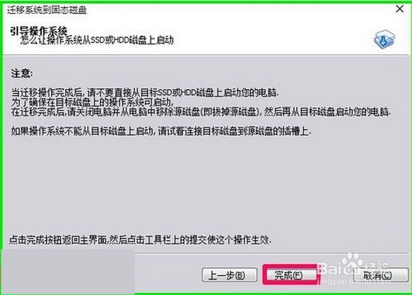 注意:迁移完成后,请不要直接从目标SSD或HDD磁盘上启动您的电脑,为了确保在目标磁盘上的操作系统可启动,在迁移完成后,请关闭电脑,从电脑中移除源磁盘,然后再从目标磁盘启动您的电脑。如果操作系统不能从目标磁盘上启动,请你试着连接目标磁盘到源磁盘的插槽上。