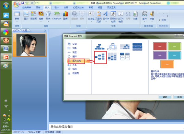 2、选择“层次结构”,用鼠标左键点击自己想要插入的组织结构框架图或流程图。