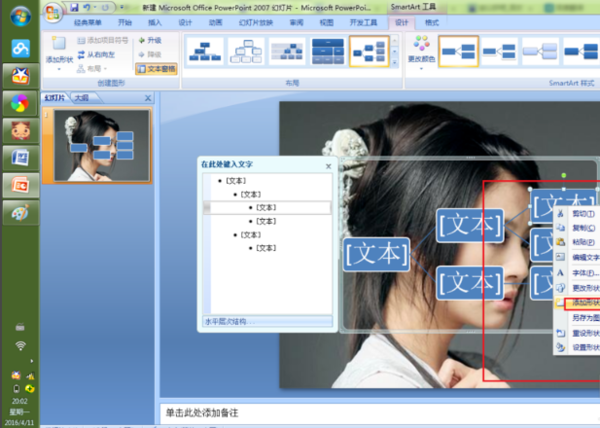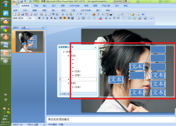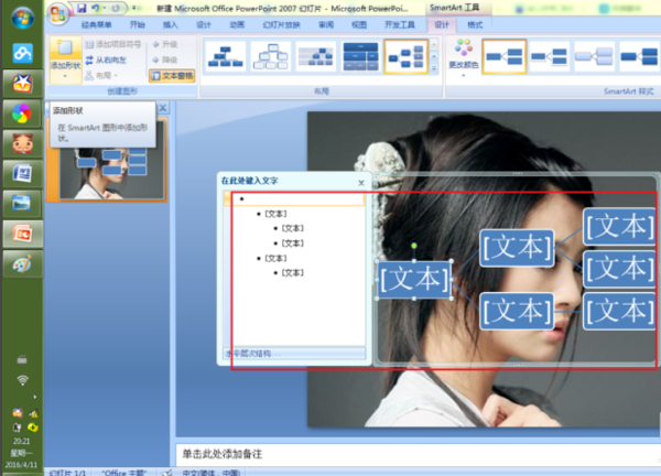 PPT2007中,插入SmartArt图形后弹出SmartArt工具选项卡——设计——创建图形——文本窗格——在SmartArt图形左侧出现文本编辑窗格,依次编辑文本,回车添加输入框,同时SmartArt图形中增加相应的形状,要添加下一级图形,在文本窗格回车后按键盘上的tab键即可。不过也可以在SmartArt图形上单击某个形状,然后在工具栏“创建图形”中选择相应的位置插入形状即可。