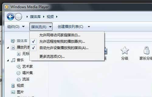 1、首先在电脑上启动Windows7系统的Windows Media Player,“媒体流”,先启用媒体流,选择“允许远程控制我的播放器”、“自动允许设备播放我的媒体”(出现提示时,选择允许),Windows Media Player不要关闭。