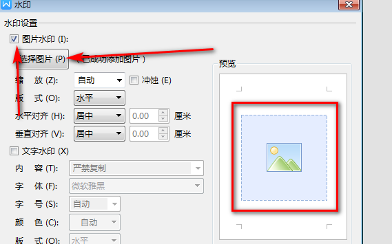 2、然后在打开的设置水印对话框中点击“图片水平”并选择一张图片作为水印。