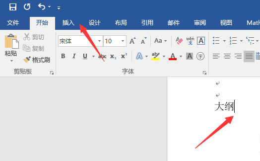 1、如图所示,我们想要在大纲后面添加一个大括号,首先,我们点击页面如图所示的插入