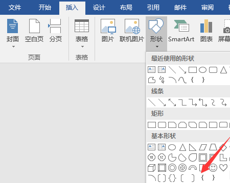 2、点击插入后,形状下面就可以找到大括号了,如图所示