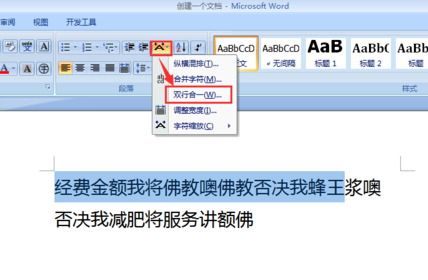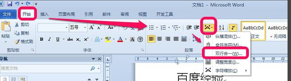 2、点击word的上方功能选项卡的开始—》段落栏里面的中文版式,选择双行合一,如图: