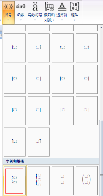 2、进入公式编辑状态,选择括号模板中如图所示的模板;