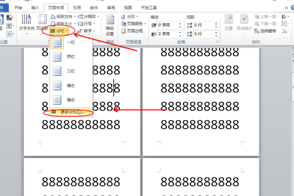 单击“页面布局”选项卡,在“页面布局”功能区中单击“分栏”按钮,打开一个下拉菜单,如下图所示,从中选择相应的栏数即可。