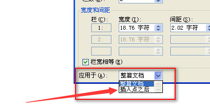 3.打开分栏的对话框,预设选择:两栏,应用于选择:插入点之后。
