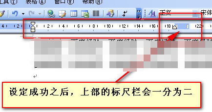 4.分栏设置完成之后,页面上方的标尺栏将会一分为二,开始在左分栏中插入文字。这样就解决了怎样将word其中一页分栏的问题了。