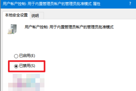 3、然后我们在弹出来的窗口中点击打开“用于内置管理员本地账户的管理员批准模式”,之后选择“已禁用”。