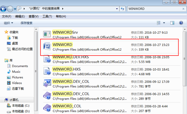四、在搜索栏中键入WINWORD回车即可搜索出word