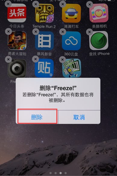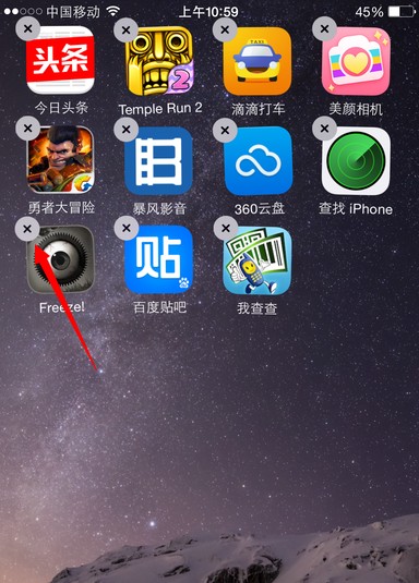 2、直到屏幕所有软件图标左上角都有一个×号,并且都在不停的跳动,这时点击左上角的×号。