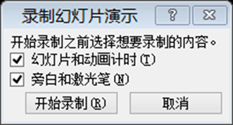 3.接下来我们需要录制视频的准备内容:在“幻灯片放映”选项卡中找到“录制幻灯片”演示,并选择“从头开始录制(S)”,这时,会询问要录制什么,第一项(幻灯片和动画计时)必选,而第二项,(旁白和激光笔),如果你需要录制一些手势(如在幻灯片上书写文字做注释)或者是录音,则选择,否则不选。