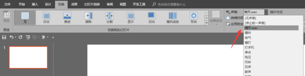 2、幻灯片切换存在音频文件。查看下幻灯片切换处,是否有从其它PPT中复制过来的音乐。更改成无声音后,再进行转换。
