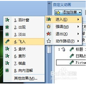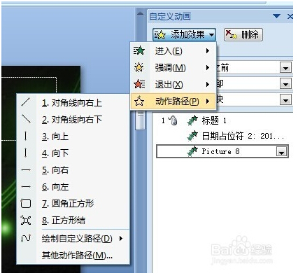 11、上面已经介绍一部分动画设置,现在直接进行动作路径设置。选中一张图片,点击添加效果,如图设置。在这里你可以选择你想要的动作,直线,曲线等等,请读者自行选择,不再一一说明。