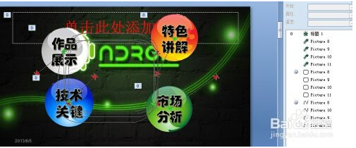 4、这时,PPT文档右侧会多出来一些功能。 在你本页PPT上放上一张图片。(要对它设置动画)