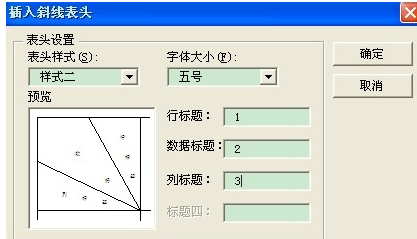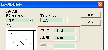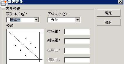 2.在弹出的“插入斜线表头”对话框中,在“表头样式”的下拉框中选择一种表头样式,在“行标题”和“列标题”中输入需要的文字内容,在“字体大小”的下拉框中可以选择合适的字体大小,最后单击“确定”按钮。