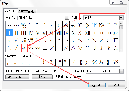 2.在弹出选项卡中,字体选择普通文本,子集选择数字形式,选择勾就行。