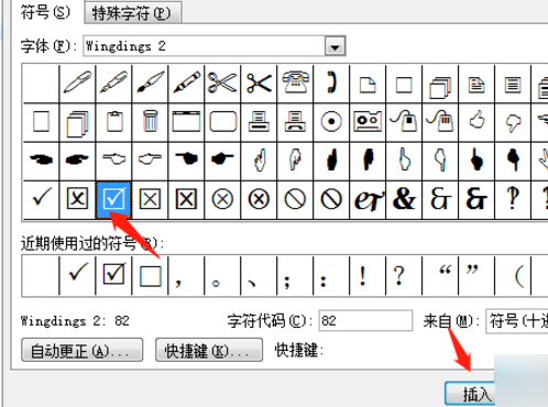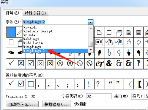 4、然后在字体选择中找到Wingdings 2,选择之后,就会在下方显示方框里带勾的图案。