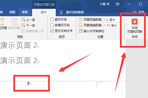 3、这时页码就会在文档底部的中间显示,然后点击“关闭页眉和页脚”按钮完成设置: