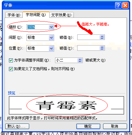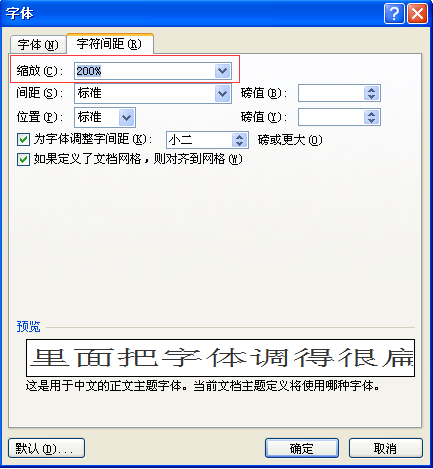 请问在WORD里把字体设成扁一点的,应该怎么设置啊?