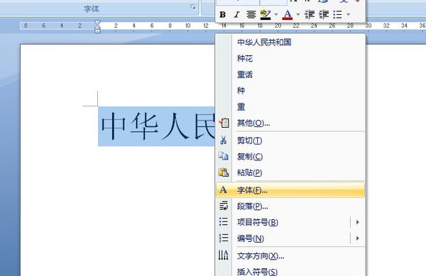 1、选中想要调整的文字,在选中区域点击鼠标右键,选择“字体”: