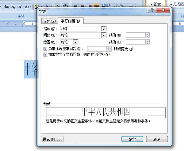 2、弹出字体对话框,选择字符间距选项卡,在缩放处将缩放比例调为200%即可,如图所示。