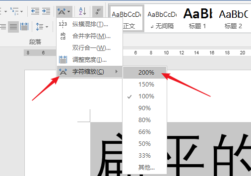 4、然后点击【中文版式】—【字符缩放】,选择大于100%的数值。