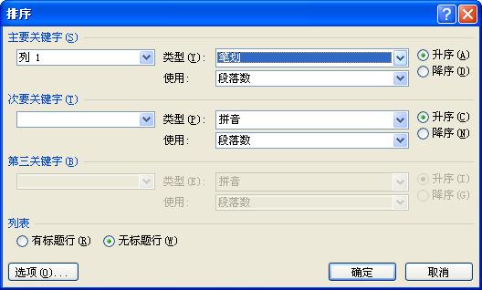 第二步、在排序对话框,主要关键字默认是列1不管他,类型,我们设定成“笔画”,使用选择默认的“段落数”,然后点击确定。