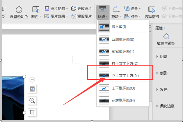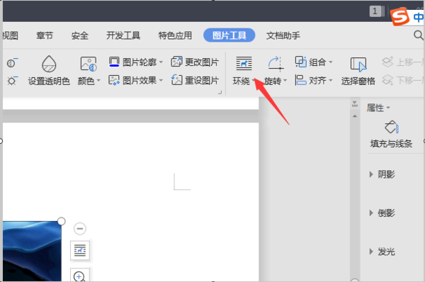 4、在进入设置对象格式选项后,点击上方图片工具栏中的环绕选项右下角的三角形扩展菜单打开环绕设置的扩展选项。