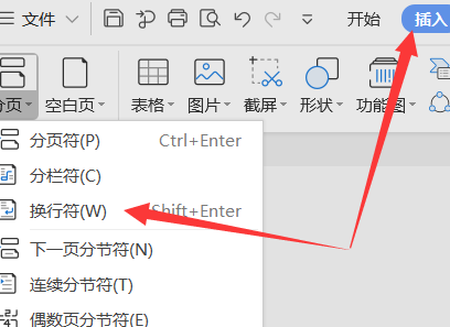 1、点击工具栏中的“插入”选项,找到“分页”,在下拉框中选择“换行符”。