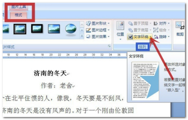 2、双击图片,进入“图片工具”,点击“排列”功能组中的“文字环绕”。
