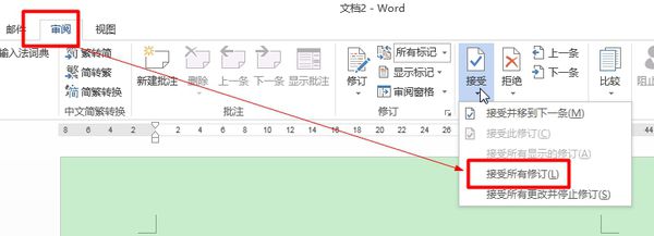 2.接下来,要在word窗口中的水平标尺的上面,找到如下图的操作区域,该区域是“审阅”工具栏上面的功能,如下图。