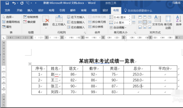 1、新建了一个word,然后在里面插入了一个表格,从表格中可以看出我们需要求出总和和平均数