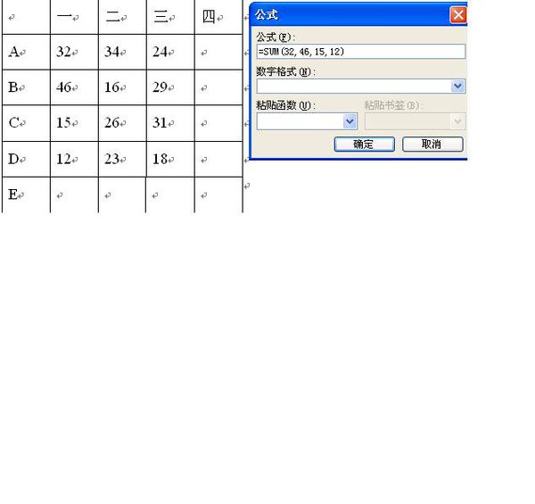 打开word——表格——公式粘贴函数--sum,在输入栏里就会显示=SUM()