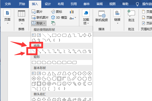 2、在插入工具栏中点击“形状”按钮,然后在“线条”选项中点击第一个直线按钮: