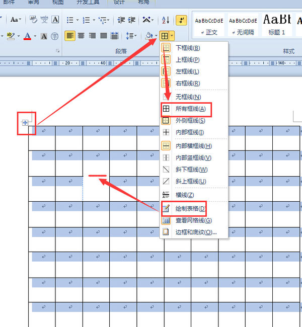 点击表格左上角十字选中整个表格,点击边框下拉菜单中选择所有框线。