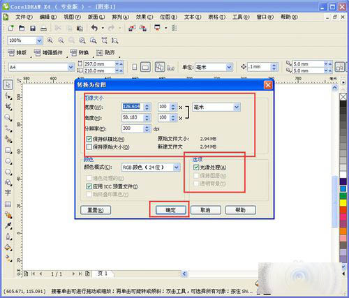 5、点击导出后,会出现一个调整属性框,在这里可以调整文件的大小和分辨率(一般选择默认)。设置完成后,点击确定。