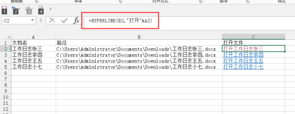 4、在C列使用HYPERLINK函数创建链接,公式为:=HYPERLINK(B2,"打开"&A2)